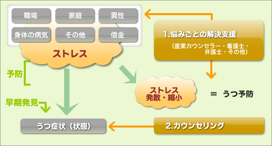 「なんでも相談」としてアナウンスし、相談しやすい環境をつくることで、「うつ予防」「うつ症状の早期発見」につながります。